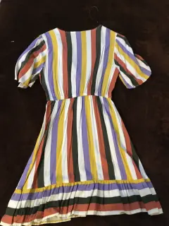 Vestido multicolor, corto, cuello V. Tela ligera. Talla M. Color morado, amarillo mostaza, rojo, y negro, con patrones lineales