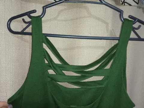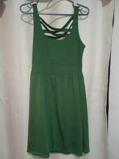 Vestido. Vestido corto, tirantes y detalle en la parte trasera. Arriba de las rodillas, con muy poco volumen. Justo para calores