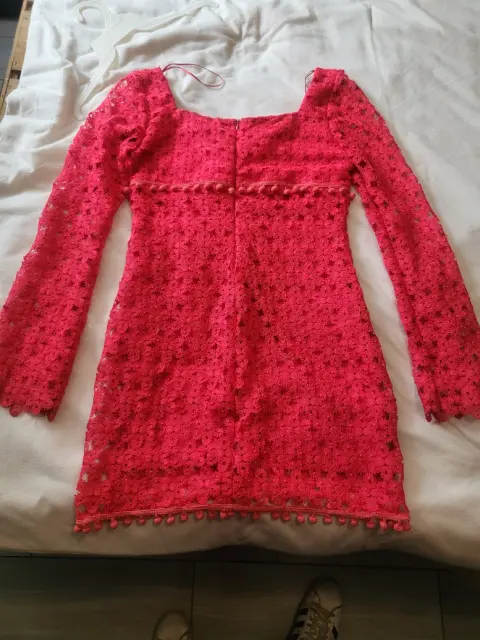 Vestido encaje, corto, talla 8 marca ivonne, rojo, e celeste estado, manga larga, ancha