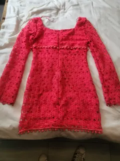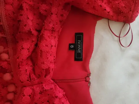Vestido. Vestido encaje, corto, talla 8 marca ivonne, rojo, e celeste estado, manga larga, ancha