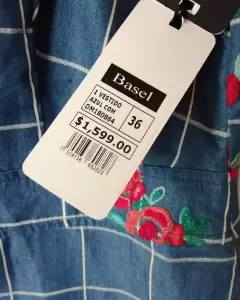 Producto nuevo. Vestido marca Basel con estampado a cuadros y flores bordadas, cierre invisible, hombros descubiertos y tirante delgado. Talla 36. Forro 100% poliéster, vestido 40% algodón, 60% poliéster.Medidas: ancho busto 52 cm, ancho cintura 45 cm, cadera 55 cm, largo 95 cm.