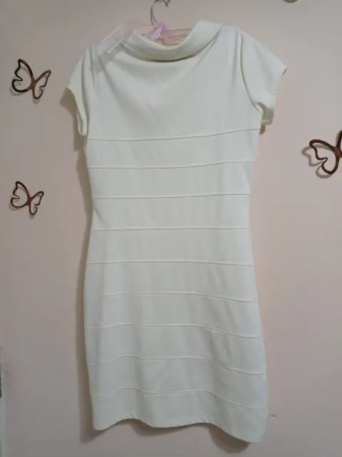 Vestido maga corta y detalle cuello, tela strech, es a la rodilla