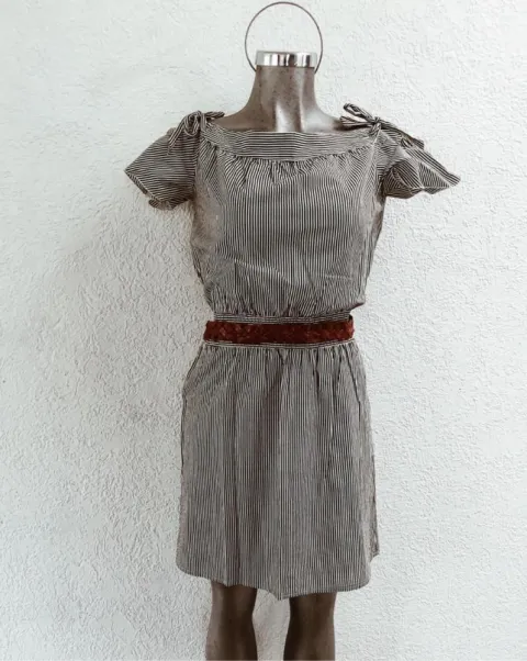 Vestido casual a rayas, queda aproximadamente arriba de la rodilla.Trae elástico en la cintura y lo puedes acompañar con un cinturón como en la foto.