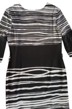 vestido a rayas. Talla 32, se pega al cuerpo, esta hecho de poliéster y elastano, se uso solo una vez en excelentes condiciones, tiene forro de color negro, manga 3 cuartos, contorno busto 93 cm, es arriba de la rodilla. adorno metálico en el pecho.