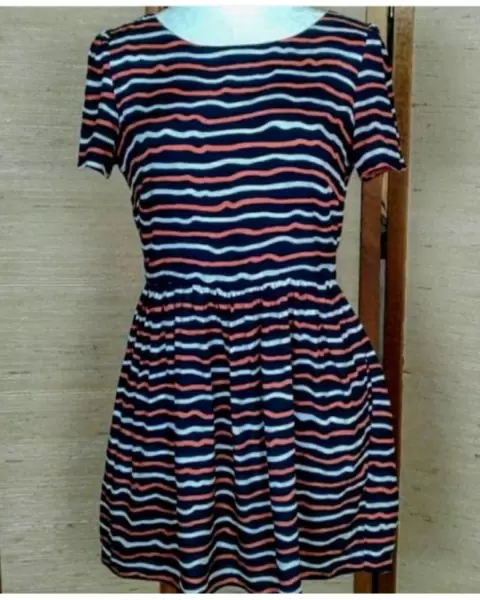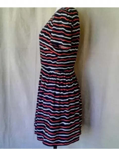 Vestido fresco con estilo marinero, a rayas, con bolsillos laterales. Se encuentra en muy buen estado, sólo tiene dos letras escritas en la etiqueta y algo de pelusa bajo las mangas, pero no se notan para nada y se pueden quitar fácilmente. PECHO 49.5cmCINTURA 40.5 LARGO 85 cm