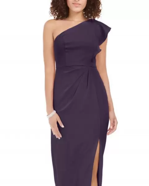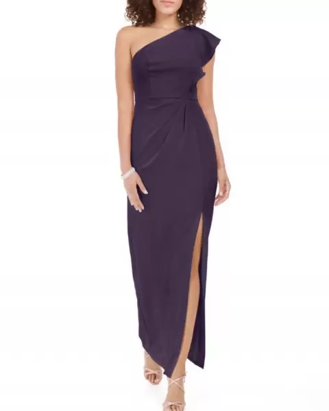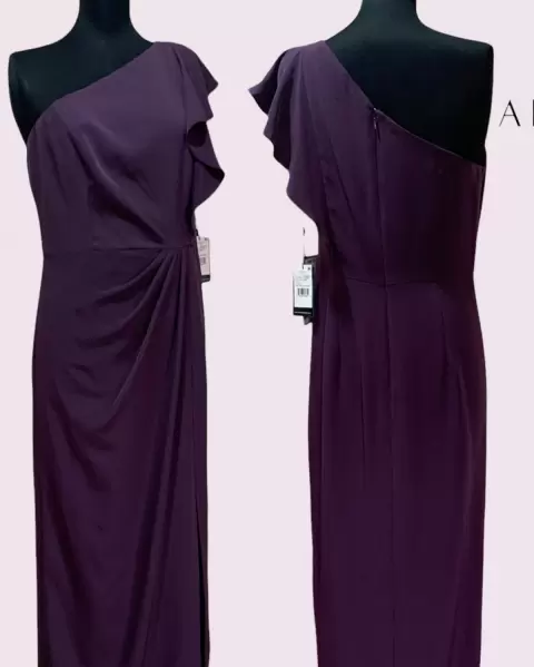 Vestido Adrianna Papell. Hermoso vestido largo de fiesta elegante, color uva, talla 8 con un hombro descubierto, largo hasta el tobillo. Medidas: Busto 91cm. Cintura 74cm. Cadera 100