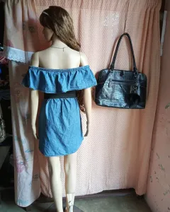 Bonito vestido de mezclilla en estilo campesino. Sin etiqueta y sin detalles. La prenda va sin accesorios. 100% algodón. Con bolsas a los lados.