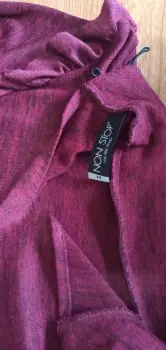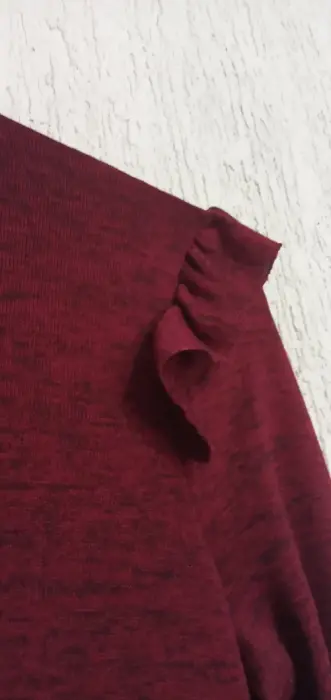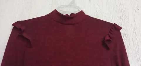 Vestido ajustado. Cuello alto medio, con 2 botones para ajustar por la parte de atrás, color vino con hilos en negro, tela delgada y calentita, con aplicación de olan en los hombros, 89 cm de largo, 62 cm largo de manga.
