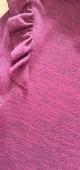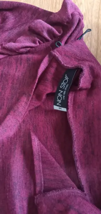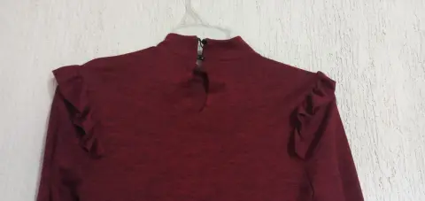 Cuello alto medio, con 2 botones para ajustar por la parte de atrás, color vino con hilos en negro, tela delgada y calentita, con aplicación de olan en los hombros, 89 cm de largo, 62 cm largo de manga.