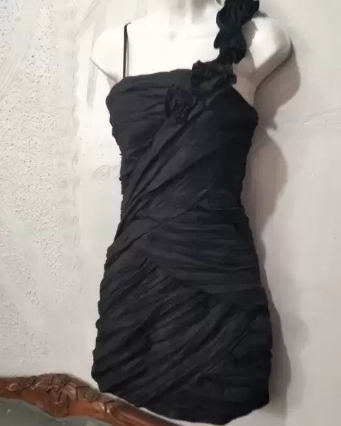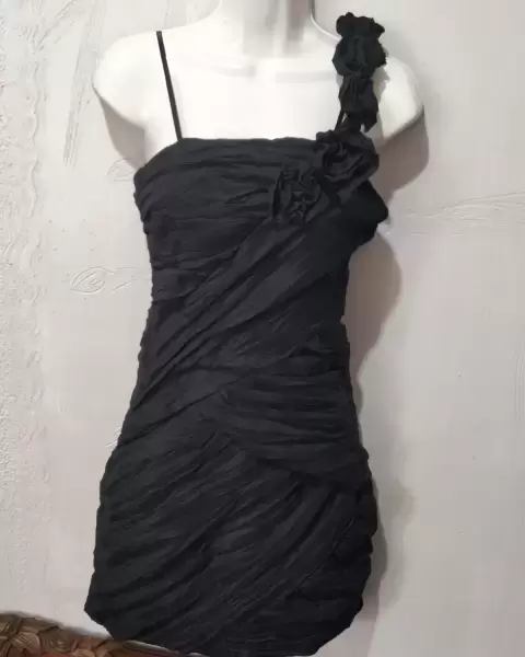 Vestido ajustado corto de fiesta. Vestido ajustado decorado con rosas en la parte del pecho y uno de los tirantes. Cierre oculto en la parte de la espalda. Solo se uso una vez.