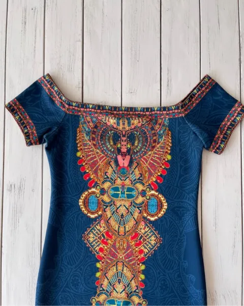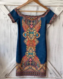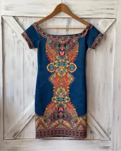 Vestido ajustado multicolor. Vestido sin hombros con manga corta, es stretch y no cuenta con cierre. Medidas: 39.5 cm de axila, 34.5 cm de cintura, 40 cm de cadera y 72.5 cm de largo.
