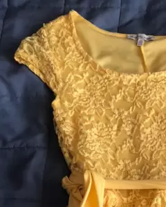 Hermoso vestido de encaje de flores amarillo en excelentes condiciones con listón para moño (se puede retirar). Estilo cocktail, largo aprox a las rodillas.