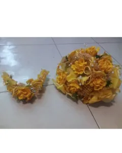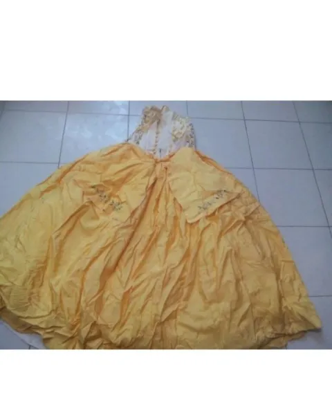 Vestido de XV años color amarillo, con el corset de manta con aplicaciones de flores, estraple.Incluye ramo y tocado, en muy buenas condiciones.
