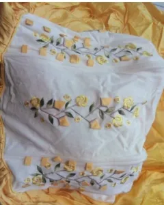 Vestido amarillo con corset de manta. Vestido de XV años color amarillo, con el corset de manta con aplicaciones de flores, estraple.Incluye ramo y tocado, en muy buenas condiciones.