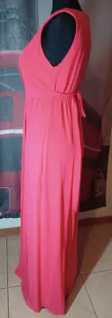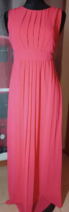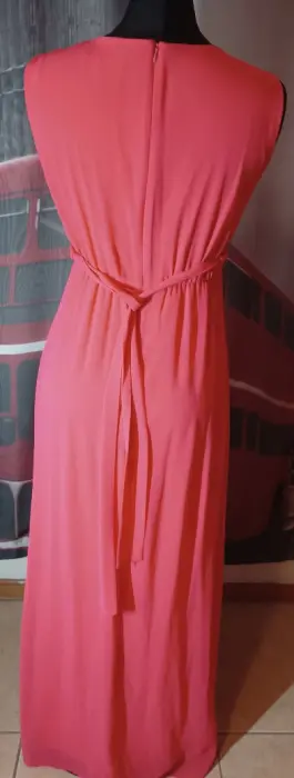 Hermoso vestido color coral, de tela shifon con forro. Tiene resorte a la cintura, lo que lo hace muy agusto el talle es M puede quedar para embarazo. Es largoPuede quedar para un evento