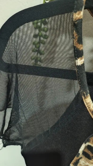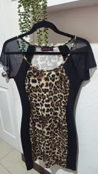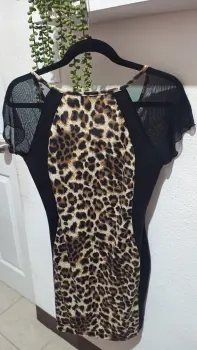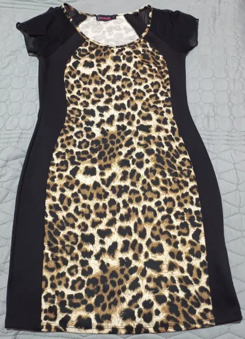 Bello vestido animal Print, talla M, los laterales negros hacen que tú figura se vea más linda, mangas cortas de tela transparentes con un ligero vuelo. Strech.Medidas:Largo. 84 cmCintura. 36 cmCadera. 45 cmAxila. 40 cmHombro. 33 cm