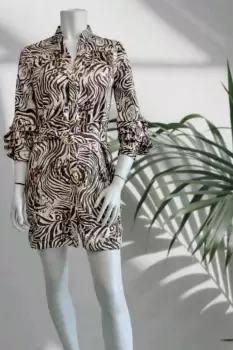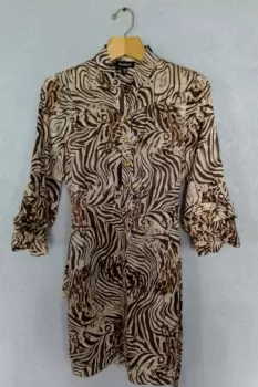 Vestido tipo camisero, animal print, con cinturon, tela satinada manga 3/4 abullonada, botones dorados, bolsas a los lados. viene amplio da hasta a una talla chica (Le falta el boton que va en la parte del cuello) no Afecta.