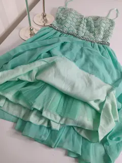 Vestido Aquagreen princess talla S. ✨Vestido con vuelo de princesa, talla S, color verde agua - menta, con cinturón de pedrería completo, corset firme y cierre completamente funcional, tirantes delgados y faldilla con volumen.✅ MEDIDAS:- Largo: 86 cm- Cintura: 62 cm. (Arriba del ombligo)- Pecho: 66 cm.