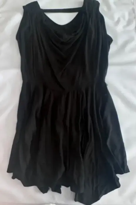 Vestido asimétrico corto. Hermoso vestido con cinta para reestrenar. Es a la rodilla de corte asimétrico ligeramente, lo que lo hace verse hermoso. La caída de la parte trasera lo hace lucir elegante. El cuidado fue en Tintoreria