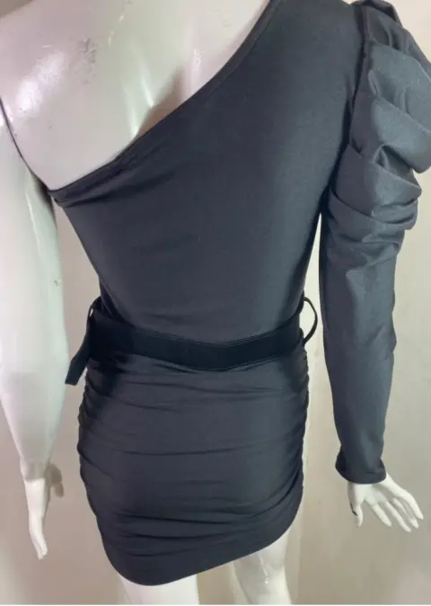 Vestido asimétrico negro. Vestido en licra satinada de un hombro con una manga abullonada con cinturón de la misma tela, es recto y corto la talla es única y queda a chico y mediano