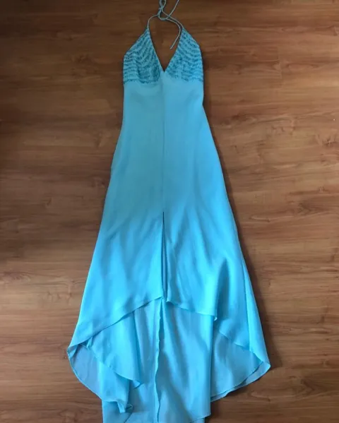 Marca IVONNE línea couture, puesto en una ocasión y se llevó a tintorería. Las fotos no le hacen justicia (en mi opinión) Talla 5 de la misma marca (considero queda a 28-30 o S y M) MEDIDAS: axila a axila 46cm, cintura 41cm; hecho en Estados Unidos (como lo indica su etiqueta) Color azul Aqua. Tiene sequin en parte del busto (cosido impecablemente). Tiene forro. Espalda descubierta. Se ata en cuello. Abertura frontal en asimétrico en el medio como se ve en fotos 4 y 5. Hace muy linda figura y tiene excelente caida ❤️ EL MEJOR PRECIO ES EL PUBLICADO, pero abierta a ofertas justas y razonables. PRENDAS NUEVAS no puedo bajarme demasiado. PRENDAS C/ USO quizas podamos negociar (aunque tengo pocas) Ten x seguro q conmigo te estás llevando ALGO BIEN (ni ropa de paca, ni cosas para la basura) Muchas Gracias ☺️