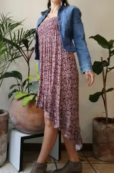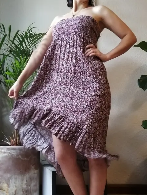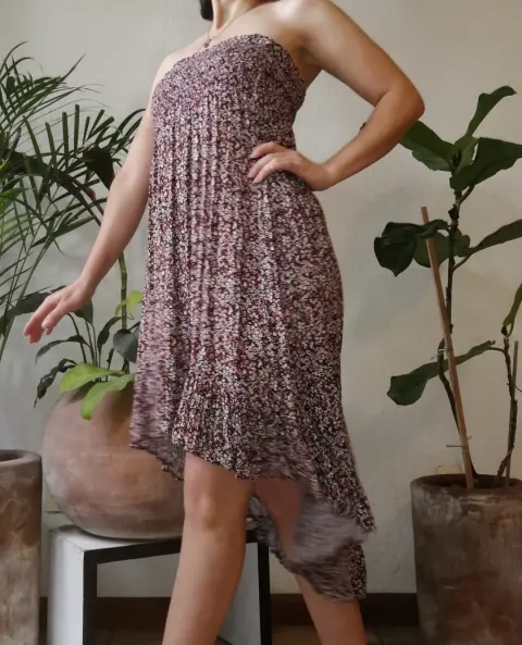 Divertido vestido casual strapless asimétrico. Frente más corto y más largo de atrás. Top es drapeado stretch, ajusta muy bien y no se mueve. Ajusta para talla de 4 a 7 y busto de 32A a 36B. Estampado floral pequeño, ideal para aparentar mayor estatura. Se puede estilizar con mezclilla, botas o sandalias. ¡Seguro lo lucirás mejor que yo!Usa el cupón VEST10 para un 10% de descuento adicional