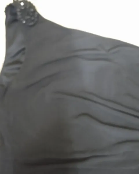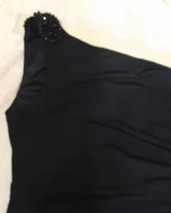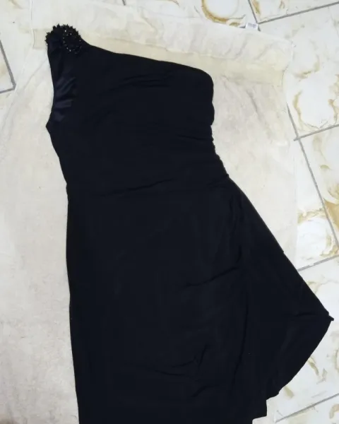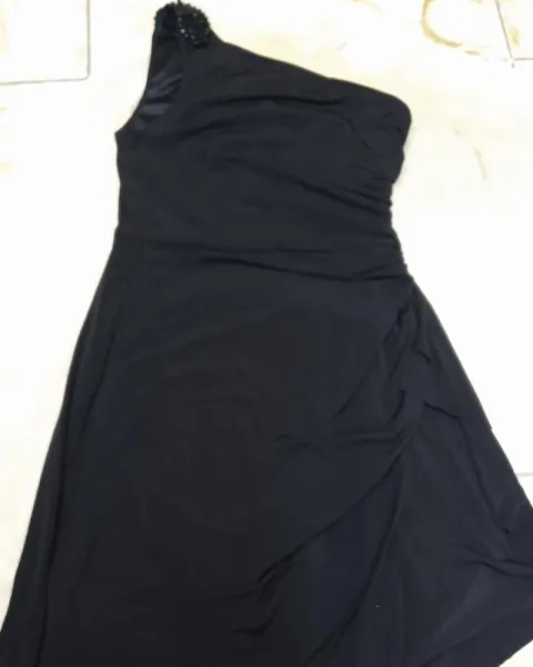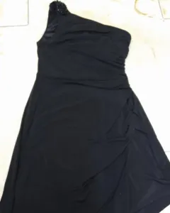 Hermoso vestido entallado pero con drapeado y olan al frente para disimular la pancita. Es de un solo hombro con recordado. Es negro muy intenso, estira pero no demasiado.