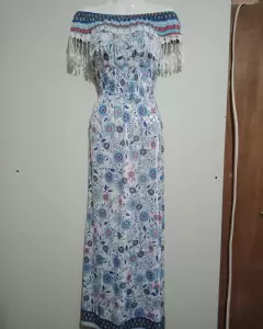Hermoso vestido largo, súper suave y fresquito. Solo lo usé una vez. Lo recomiendo para alguien delgada. Que da super bonito. A un buen precio