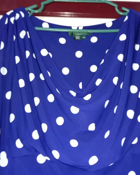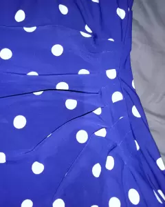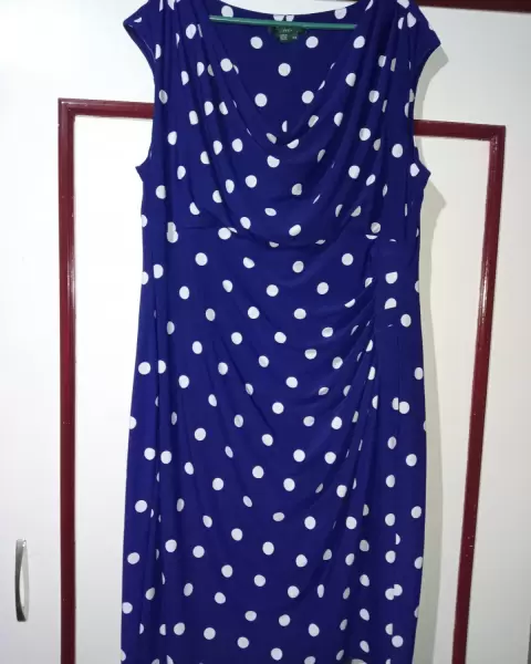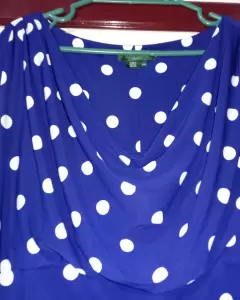 Vestido azul círculos. Bonito y femenino vestido casual, tiene cuello colgante y dobladillo en la parte de los hombros y lado derecho de la cintura. Tiene forro y la tela es amigable para amoldarse.