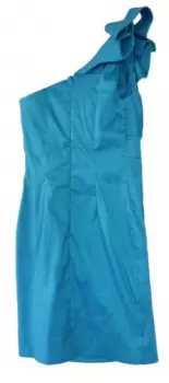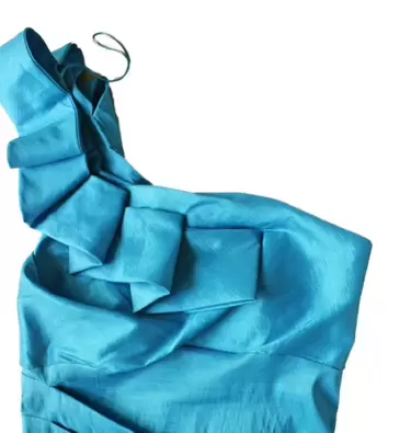 Vestido azul con drapeado al frente de un solo tirante y en el tirante tiene olanes, es corto y muy lindo tela brillosa y con peso. Ideal para primavera verano. Pieza única
