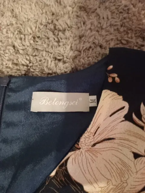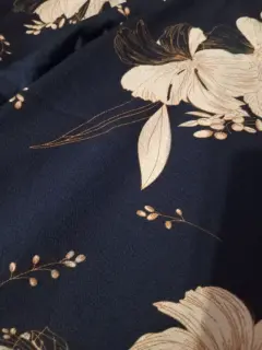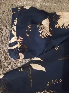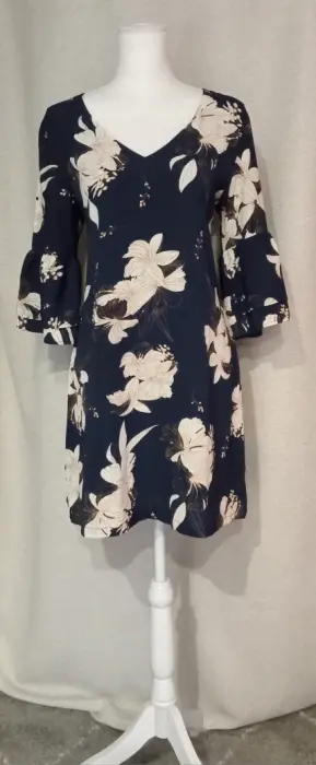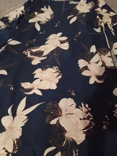 Hermoso vestido fluido azul marino con estampado de flores. Tiene holanes en mangas y cierre en espalda. Medidas hombros 41 cm, ax a ax 50 cm, largo 88 cm.