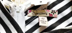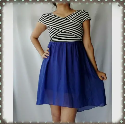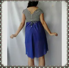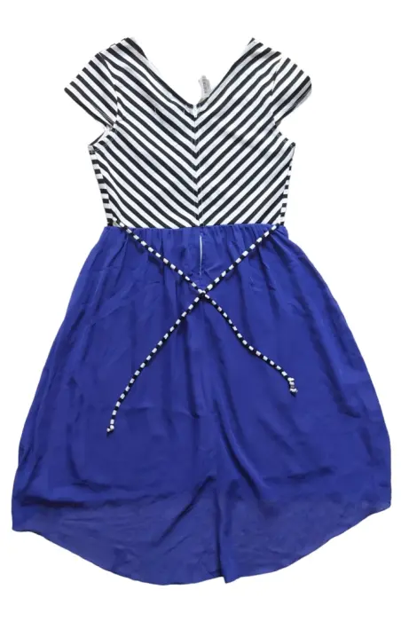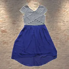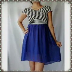 Vestido fresco asimétrico con top de rayas y falda azul con transparencia y forro, compuesto de 75% poliéster 20% rayón y 5% spandex. Marca Speechless, talla L.MEDIDASCierre 31 cm.Hombro a hombro 34 cm.Axila a axila 38 cm.Cintura 66 cm.Largo total en parte posterior 97 cm y 81 cm en parte frontal.