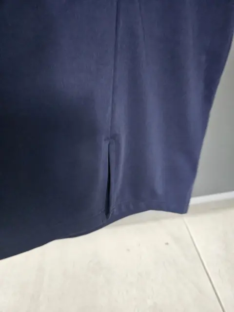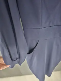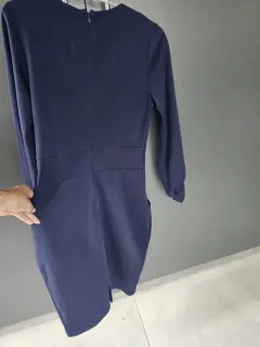 Vestido azul marino. Es un vestido que queda a la rodilla, un poco entubado, tiene abertura en la pierna para facilitar el caminar, es ligeramente escotado del busto, manga larga y amplia, con bolsas a los costados y se ajusta a tu figura.Las medidas son:Busto: 38 cmCintura: 34 cmLargo: 88 cm