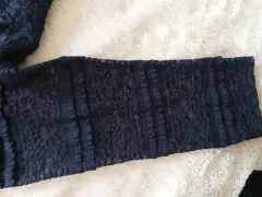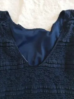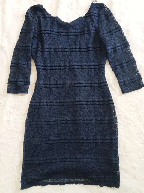 Vestido azul marino de encaje. Vestido azul de encaje, forrado altura a la rodilla. Espalda en V, manga 3/4 con encaje sin forro en manga Talla S americana, ceñido al cuerpo.