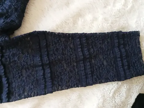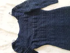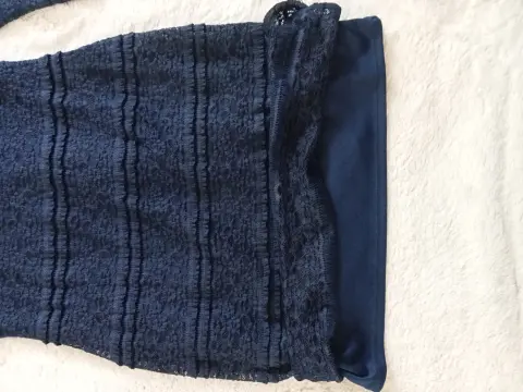 Vestido azul de encaje, forrado altura a la rodilla. Espalda en V, manga 3/4 con encaje sin forro en manga Talla S americana, ceñido al cuerpo.