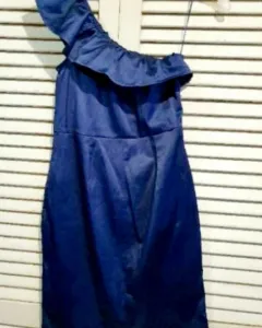 Bello vestido azul marino de tela satinada, de un solo hombro, con bolsillos a los lados, muy fresco y lindo. en buen estado!!