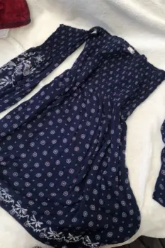 Vestido strappleMangas largas acampanadasColor azul marino con estampado y bordado en las mangas.lleva resorte tanto en el pecho como al inicio de la mangaEs corto hasta la rodilla y estira (Puede quedar incluso a talla L)
