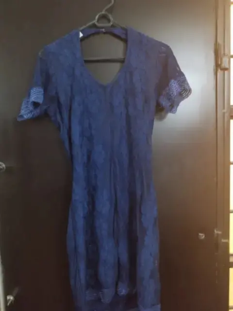 Vestido azul suelto. Vestido sin cierre. Con botón en espalda se puede utilizar un cinturón para marcar cintura ..cuenta con botón nuevo en bolsita