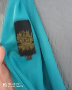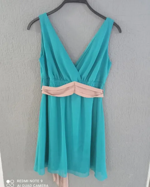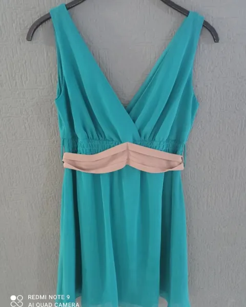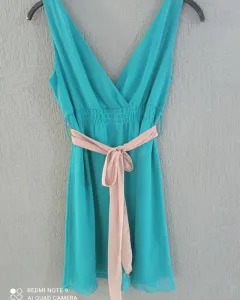 Vestido color verde turquesaMarca MetrópolisTalla sCuello V sin mangas y corto.Cintilla beige en la cintura.Precio 250