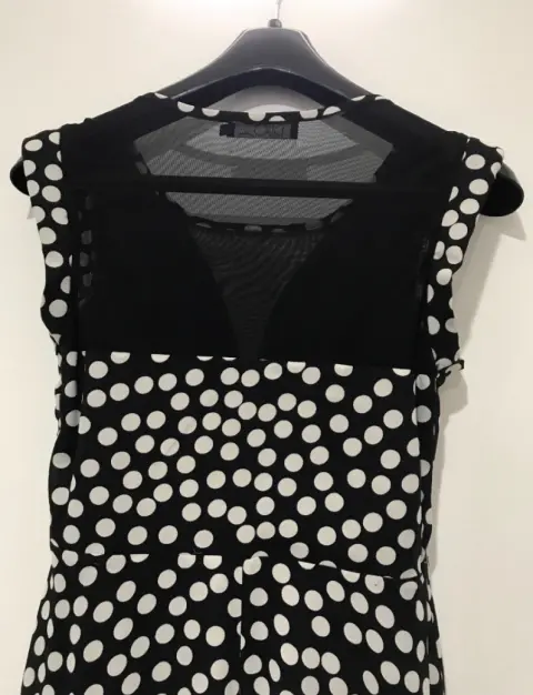 Vestido negro con lunares blancosMarca Dúo Woman Para mujerTalla chica Es asimétrico, corto de enfrente, largo de atrásenfrente tela transparente, lo cual te hace ver muy coquetaLa tela es suaveSe ha usado muy pocas vecesEs ideal para una reunión formal o fiesta.
