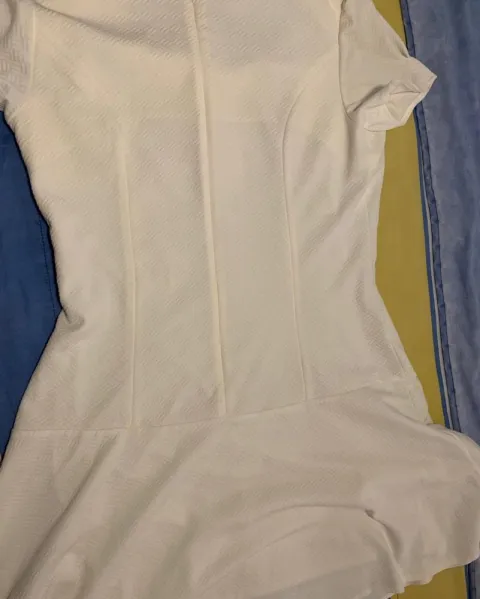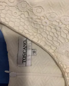 Vestido beige corte recto hasta la cadera, falda semicircular, con bordado en el escote y cierre trasero. Tiene forro pero es muy fresco, no se transparenta.