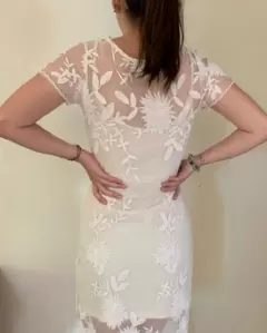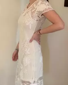 Vestido beige con malla bordada. Vestido con fondo y malla con destalle tejido de flores