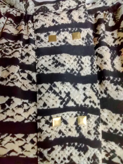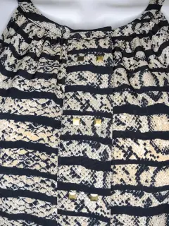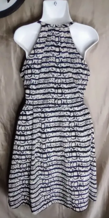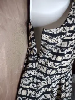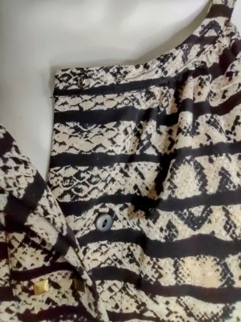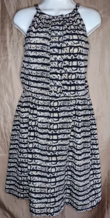 Lindo vestido, beige y líneas negras. Nuevo, talla L.Sin mangas, broche y botones al frente con aplicación de cuadritos, cierre a un costado, la falda es tableada del frente y de atrás.Axila: 52 cmLargo: 94 cm