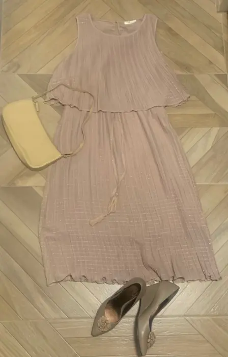 Vestido Beige- Marca Mujer Antigua- Una sola puesta- Talla M- Muy cómodo y fresco- Llega a la pantorrilla - Tiene forro- Elegante y práctico
