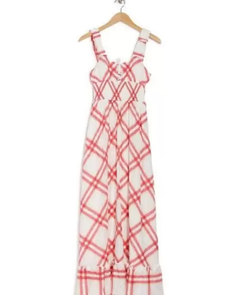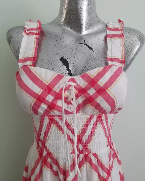 Hermoso mexi vestido de Betsy Johnson nvo, talla Mediana, de tirantes cuello bajo, con agujetas en el pecho y corrugado en la cintura estilo corset, con olan al final del vestido