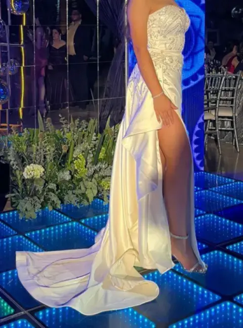 Vestido blanco. Vestido straple largo blanco con lentejuelas con abertura en entrepierna cauda desmontable