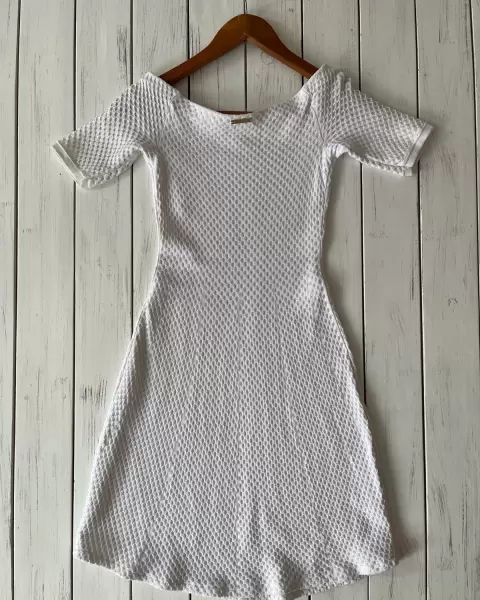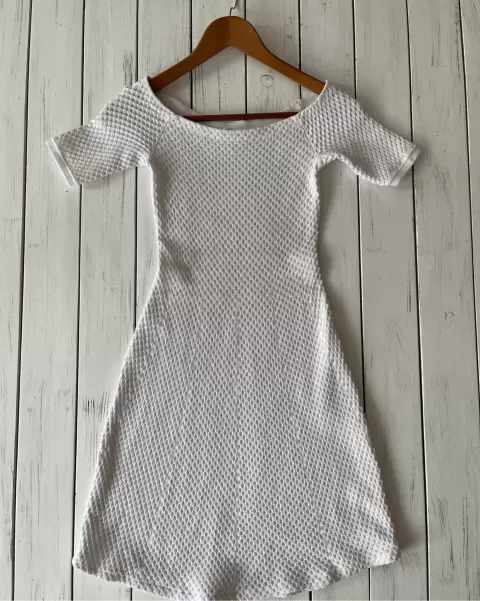 Vestido stretch blanco, tela stretch ajustable al cuerpo, manga corta y cae a los hombros.Talla: SMedias sin estirar: 32 cm de axila, 26.5 cm de cintura y78 cm de largo desde la etiqueta.Foto referencia.La composición de la tela es viscosa con nylon.No trae forro.