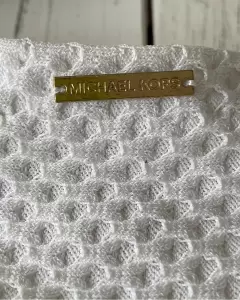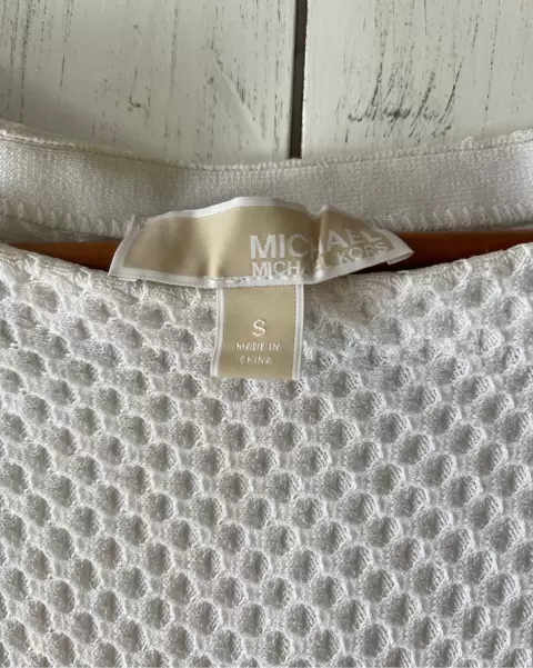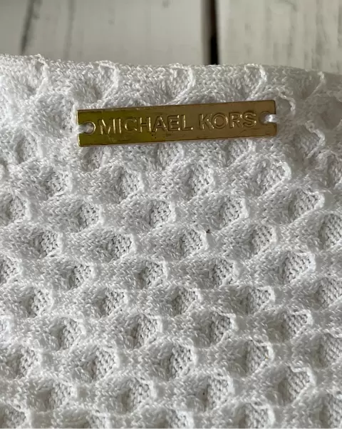 Vestido blanco a los hombros MK. Vestido stretch blanco, tela stretch ajustable al cuerpo, manga corta y cae a los hombros.Talla: SMedias sin estirar: 32 cm de axila, 26.5 cm de cintura y78 cm de largo desde la etiqueta.Foto referencia.La composición de la tela es viscosa con nylon.No trae forro.
