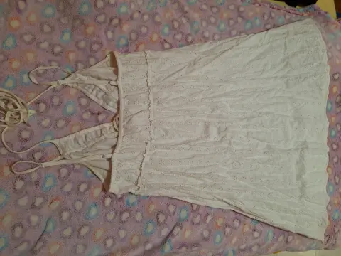 Vestido blanco bordado con tirantes. Hermoso, fresco y sexy vestido blanco, con tirantes en los hombros y en el cuello. Tiene detalles en el busto que hace que se vea muy lindo. Tiene forro para evitar que se transparente. De la espalda tiene resorte que hace que se amolde a tu cuerpo. Tiene algo de vuelo.