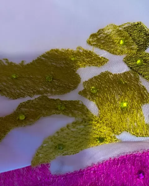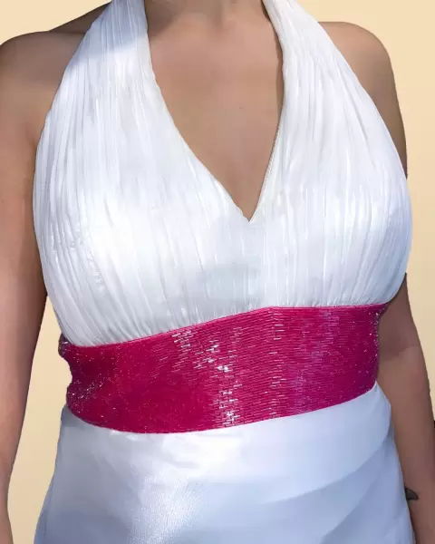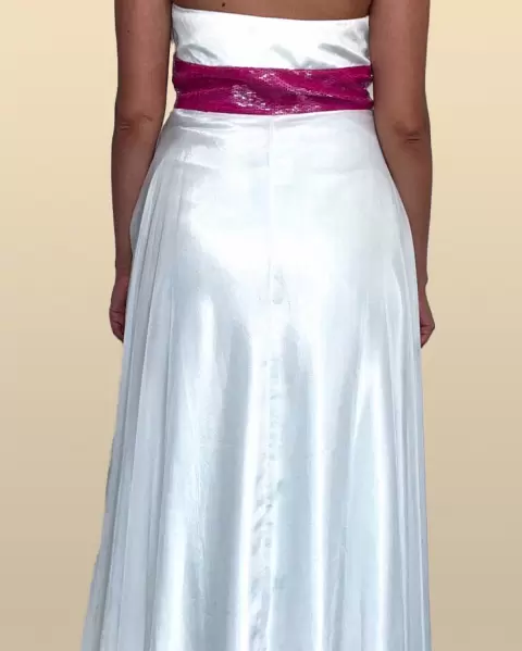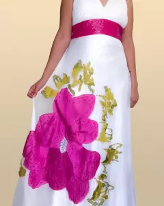 Vestido blanco con flor rosa y hojas verdes, largo talla grande, con piedritas en las flores. Usado una vez y mandado a la tintorería.